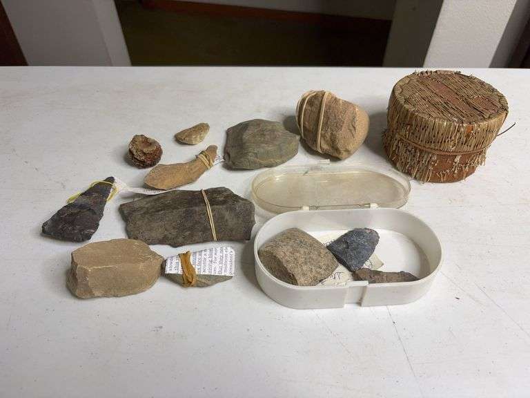 Group of small stones and chipped flint tools, several wrapped with rubber bands and paper labels