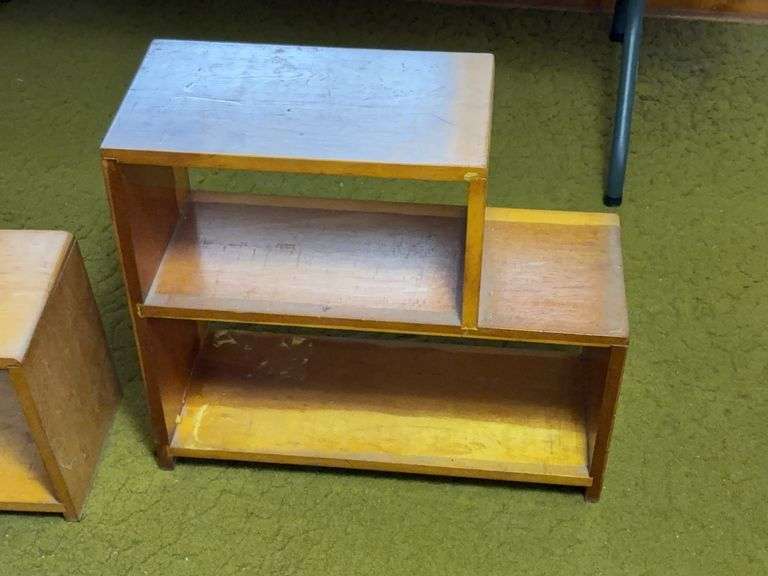 Two matching blonde-finish wooden step-style shelves, each composed of rectangular open compartments in a staggered/stacked configuration