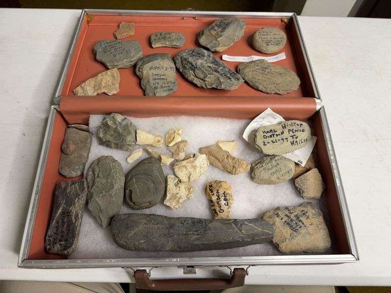 Case containing multiple shale and limestone slabs and chips, several with handwritten labels and dates; includes rounded coquina/shell-like fragments, flat shale plates, larger elongated shale piece and more