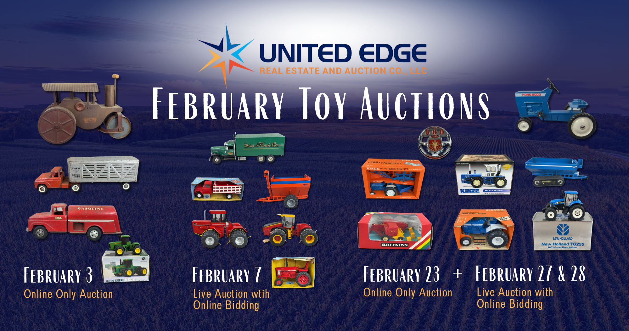 Featuring Precision Engineering, John Deere, Kinze, Ford, New Holland, Versatile, Massey-Harris, Hubley, Ertl, Nylint, Reuhl, Arcade, pedal tractors, farm sets, advertising & promotional items and more!